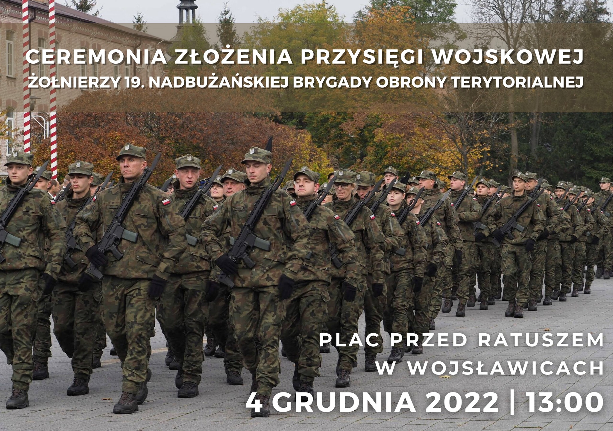 KOMUNIKAT PRASOWY 19. NADBUŻAŃSKIEJ BRYGADY OBRONY TERYTORIALNEJ W niedzielę 04 grudnia 2022 r. o godz. 13.00 w Wojsławicach, odbędzie się – druga w dziejach jednostki - ceremonia złożenia przysięgi wojskowej przez żołnierzy 19. Nadbużańskiej Brygady Obrony Terytorialnej. „Terytorialsi” przysięgę swą złożą na rynku przy ratuszu Urzędu Gminy Wojsławice, w obecności wielu zaproszonych gości.