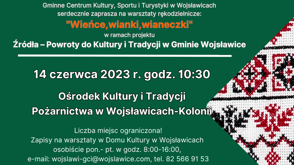 Już w najbliższą środę, w Ośrodku Kultury i Tradycji Pożarnictwa w Wojsławicach-Kolonii odbędą się pierwsze Warsztaty rękodzielnicze: "Wieńce, wianki, wianeczki", w ramach projektu "Źródła - Powrót do Kultury i Tradycji w Gminie Wojsławice", dofinansowanego ze środków Ministra Kultury i Dziedzictwa Narodowego w ramach programu Narodowego Centrum Kultury EtnoPolska. Edycja 2023.