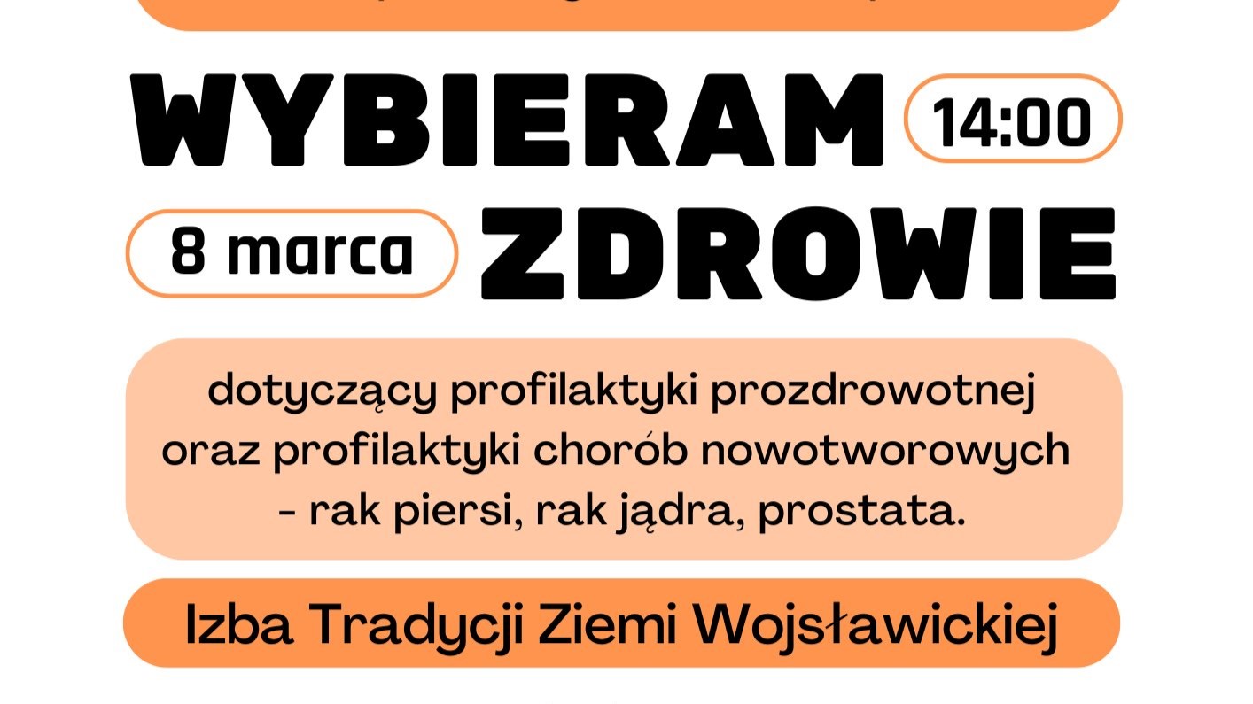 WYBIERAM ZDROWIE 8 marca 2025 r. (sobota) godz. 14:00 Izba Tradycji Ziemi Wojsławickiej, Wojsławice Wstęp wolny! Z okazji Dnia Kobiet i Mężczyzn serdecznie zapraszamy na wyjątkowy warsztat prozdrowotny pt. "Wybieram zdrowie", który będzie dotyczył profilaktyki zdrowotnej oraz profilaktyki chorób nowotworowych – raka piersi, jąder i prostaty.