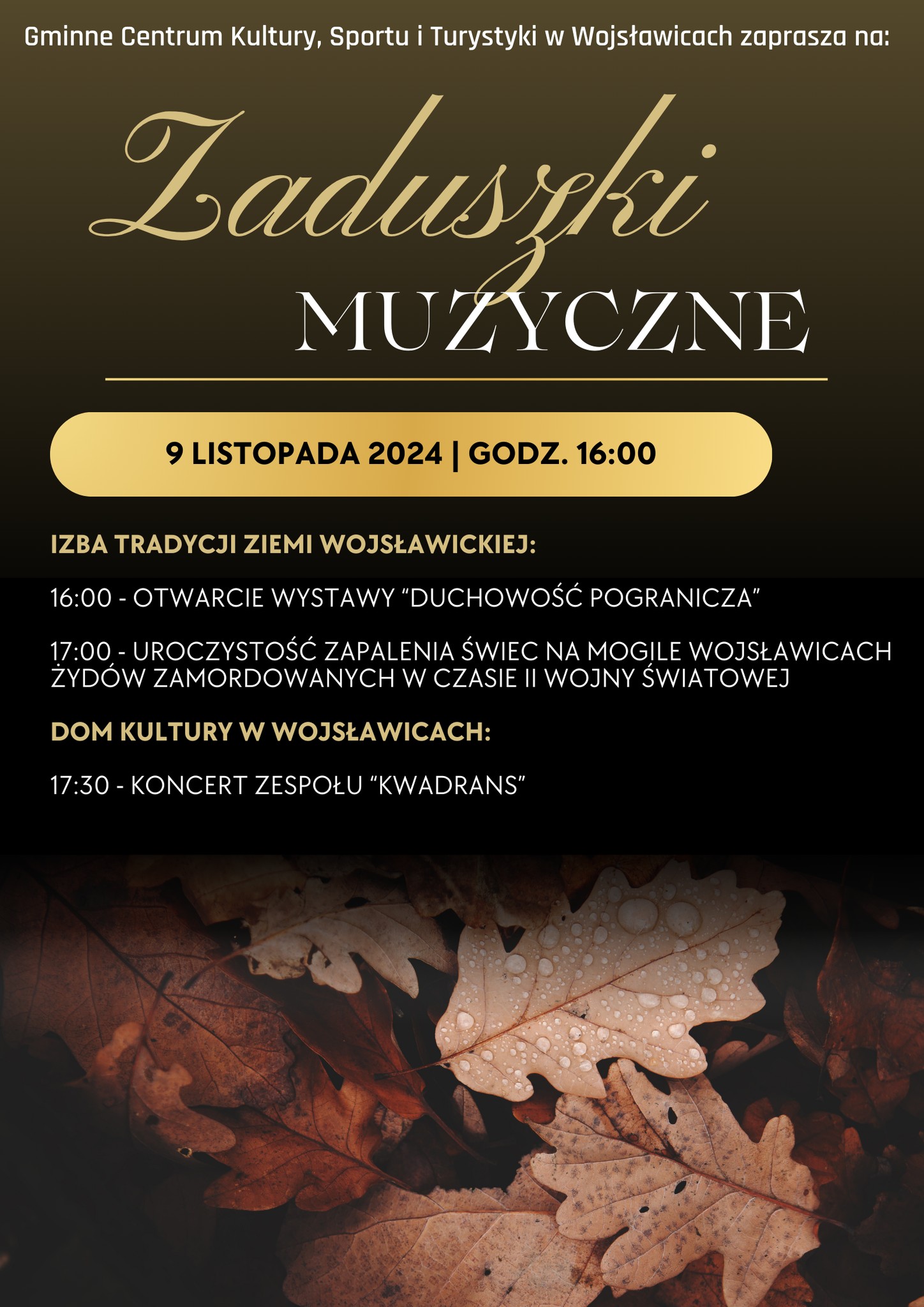 Jak co roku, w okresie jesiennym serdecznie zapraszamy na Zaduszki Muzyczne, które rozpoczną się 9 listopada 2024 roku o godzinie 16:00.