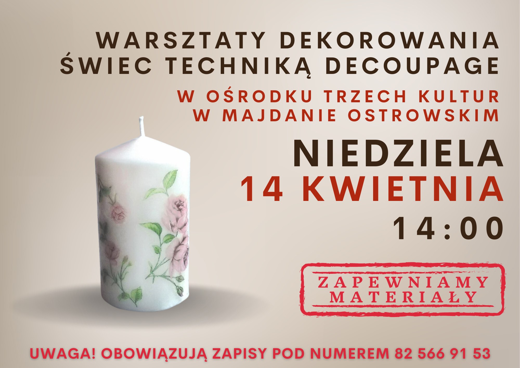 W niedzielę, 14 kwietnia proponujemy: - Warsztaty Dekorowania świec techniką decoupage - 14:00 - Ośrodek Trzech Kultur w Majdanie Ostrowskim.