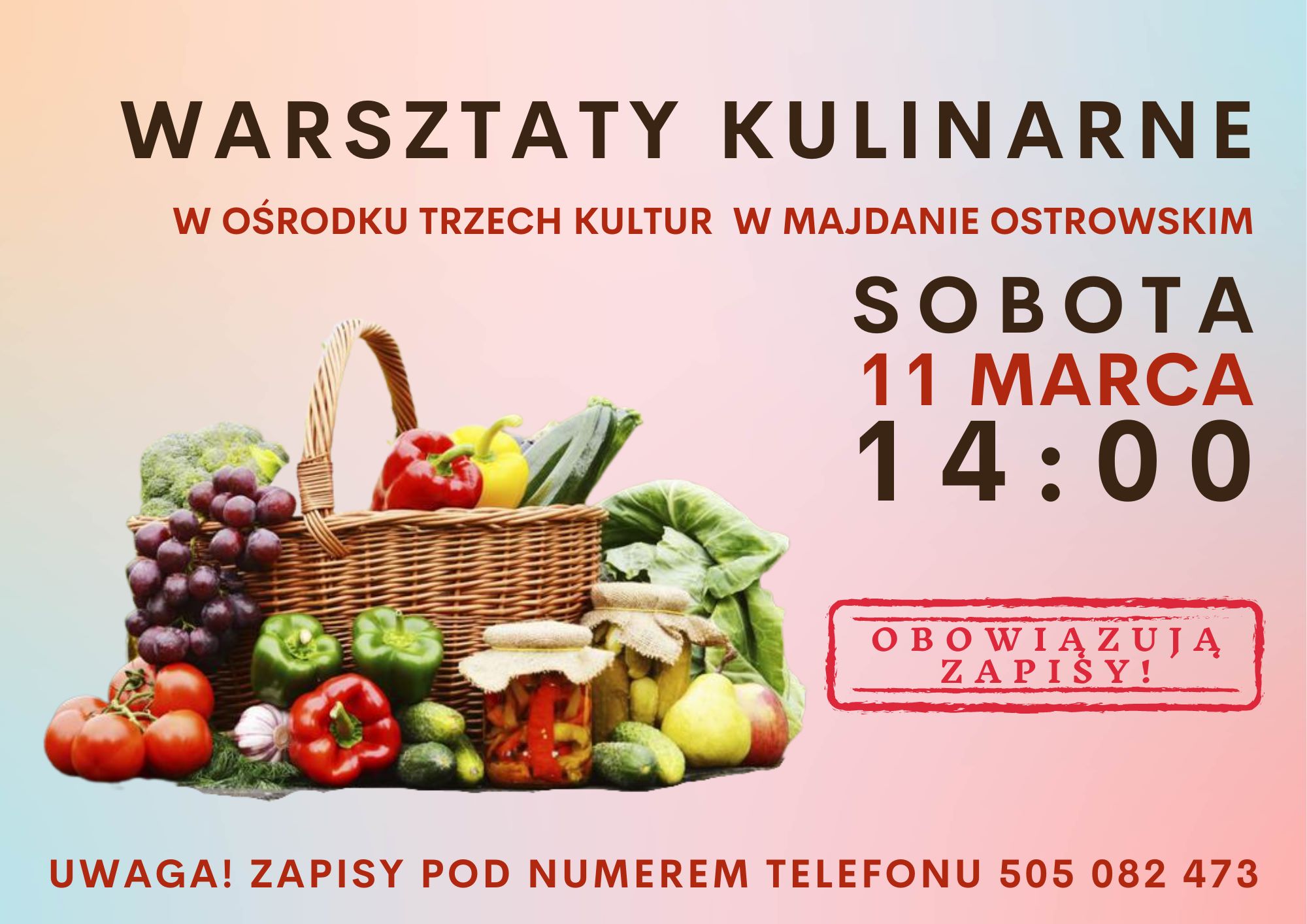 W sobotę, 11 marca na godzinę 14:00 zapraszamy na Warsztaty Kulinarne do Ośrodka Trzech Kulturw Majdanie Ostrowskim. Obowiązują zapisy pod numerem telefonu: 505 082 473. Warsztaty w Majdanie Ostrowskim mają swój unikalny klimat - każdy dobrze spędza na nich czas ;)