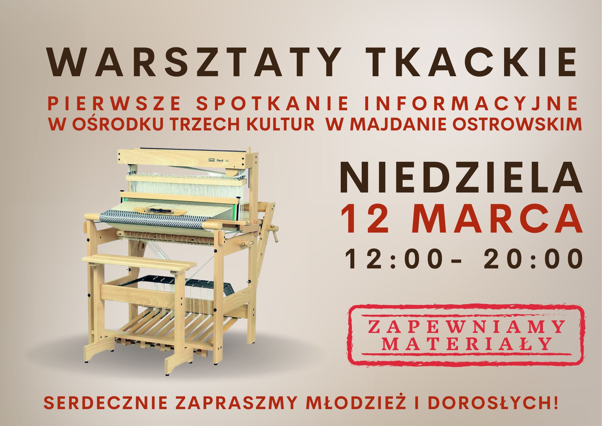 W Niedzielę, 12 marca, w godzinach 12:00 - 20:00 zapraszamy na Warsztaty Tkackie w Ośrodku Trzech Kultur w Majdanie Ostrowskim.
