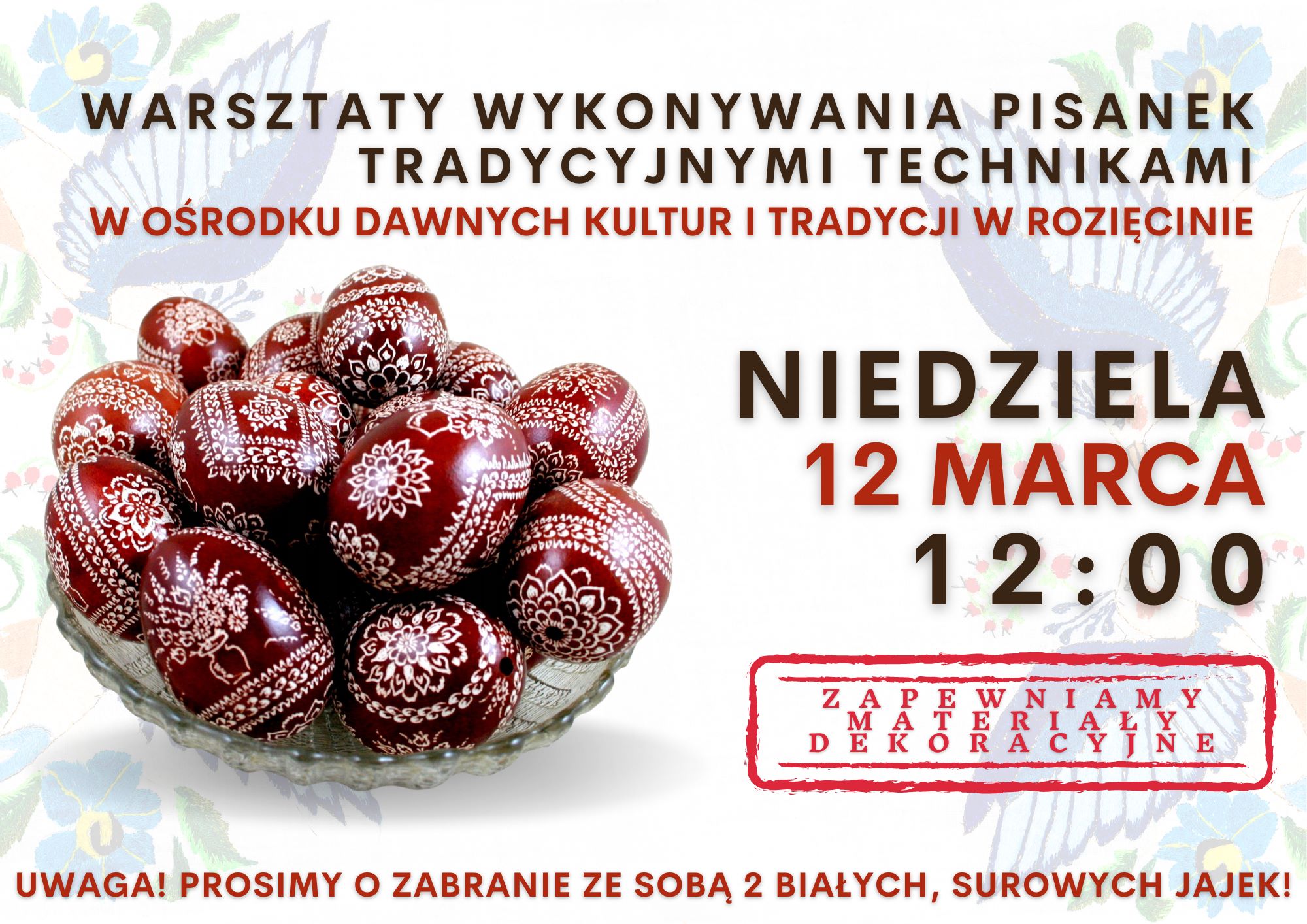 Niedziela | 12 marca | 12:00 - Warsztaty Wykonywania Pisanek Tradycyjnymi Technikami w Ośrodku Dawnych Kultur i Tradycji w Rozięcinie.