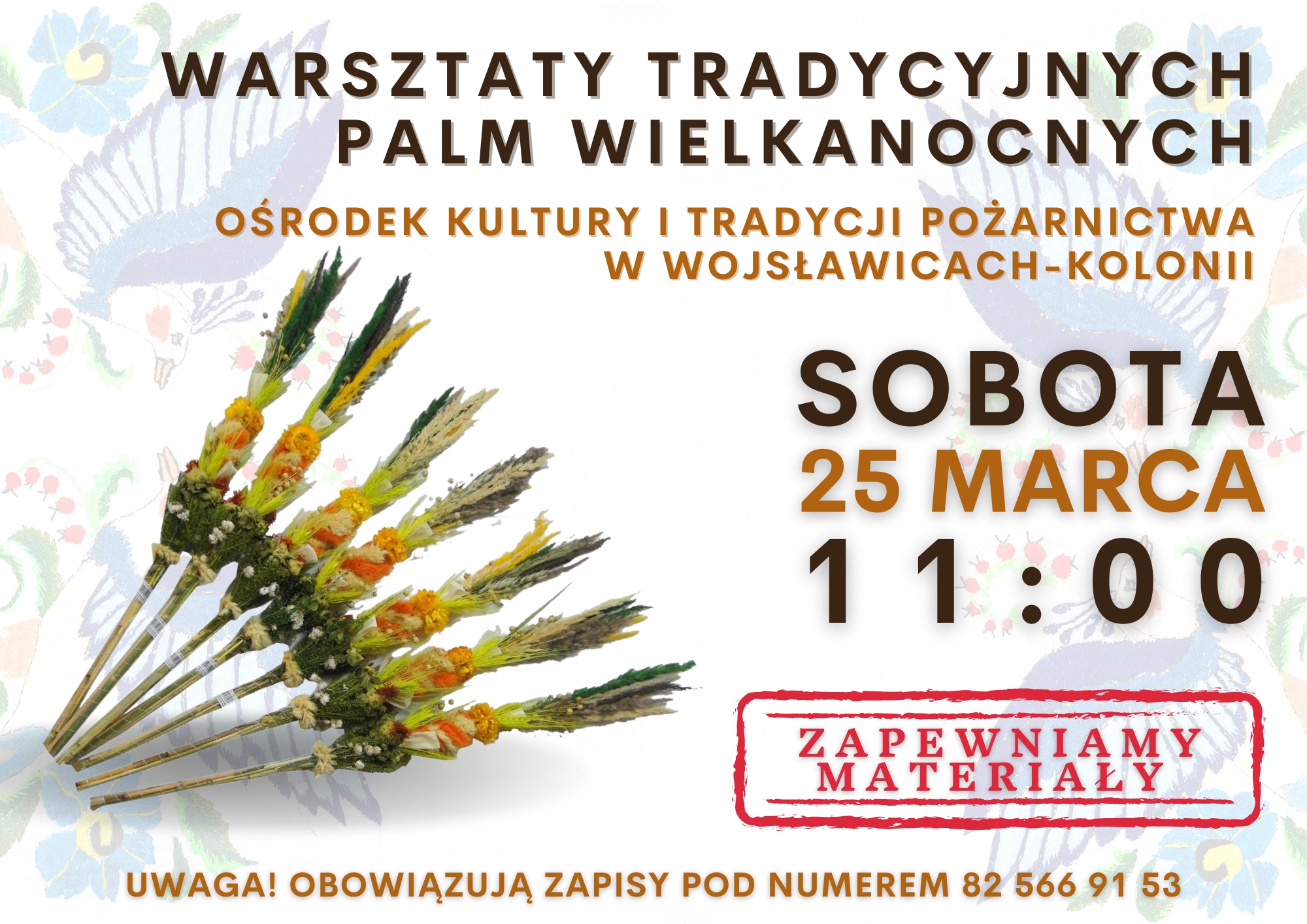 Były pisanki, to teraz pora na kolejny element wielkanocnych przygotowań! 25 marca na godzinę 11:00 zapraszamy wszystkich chętnych na Warsztaty wykonywania Tradycyjnych Palm Wielkanocnych, które tym razem odbędą się w Ośrodku Kultury i Tradycji Pożarnictwa w Wojsławicach-Kolonii.