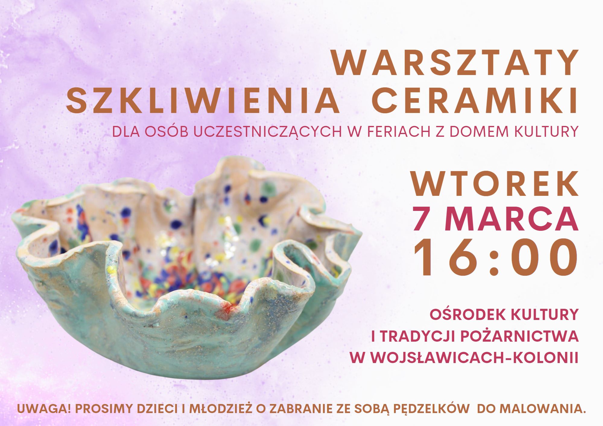 Serdecznie zapraszamy uczestników Ferii z Dom Kultury w Wojsławicach na Warsztaty Szkliwienia Ceramiki, które odbędą się we wtorek, 7 marca 2023 r. o godzinie 16:00 w Ośrodku Kultury i Tradycji Pożarnictwa w Wojsławicach-Kolonii. Warsztaty są kontynuacją zajęć rozpoczętych w trakcie Ferii z Domem Kultury, kiedy to wspólnie wykonywaliśmy naczynia z gliny. Bardzo prosimy uczestników, o zabranie ze sobą pędzelków. Do zobaczenia!