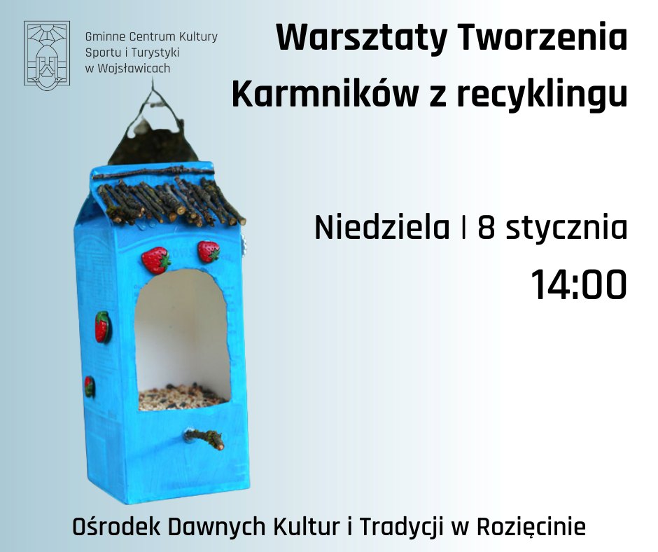 Niedziela | 8 stycznia | 14:00 Warsztaty wykonywania karmników z recyklingu dla ptaków w Ośrodku Dawnych Kultur i Tradycji w Rozięcinie.