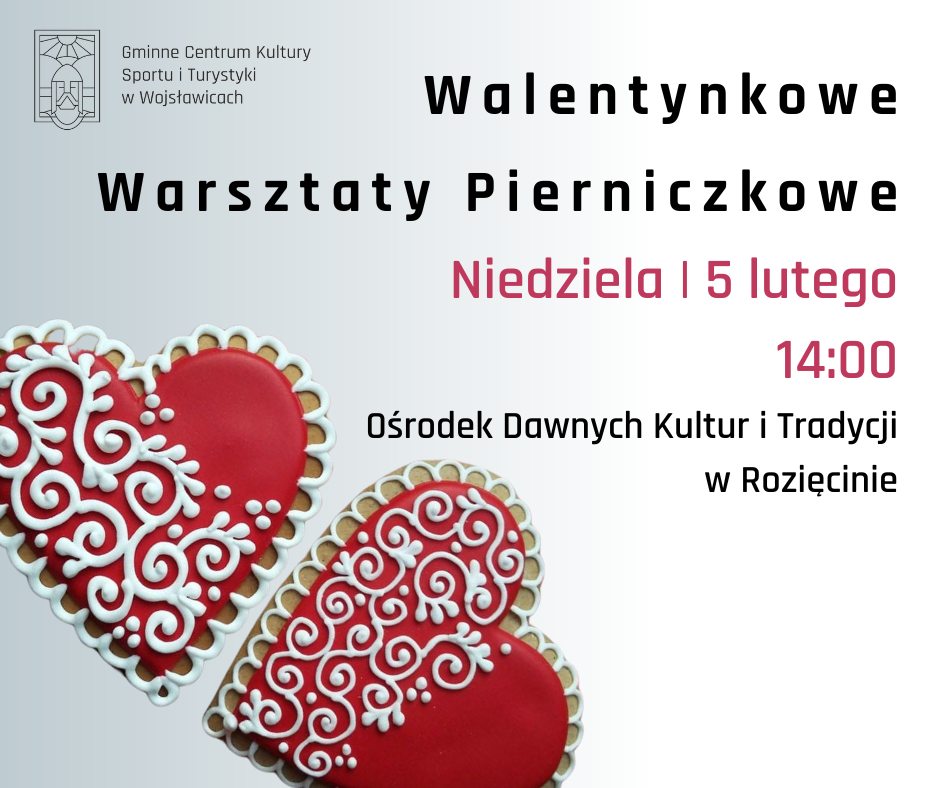 Weekend z Kulturą, więc zapraszamy na warsztaty! W niedzielę, 5 lutego mamy dla Was propozycje: - Walentynkowe Warsztaty Pierniczkowe - 14:00 - Ośrodek Dawnych Kultur i Tradycji w Rozięcinie ZAPRASZAMY!!!
