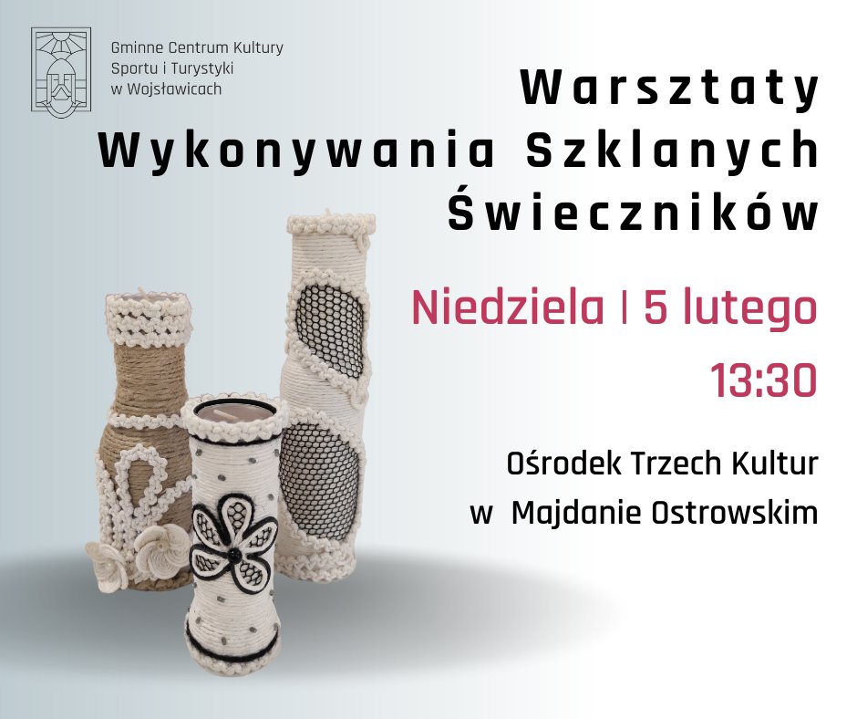 Weekend z Kulturą, więc zapraszamy na warsztaty! W niedzielę, 5 lutego mamy dla Was propozycje: - Warsztaty wykonywania szklanych świeczników - 13:30 - Ośrodek Trzech Kultur w Majdanie Ostrowskim ZAPRASZAMY!!!
