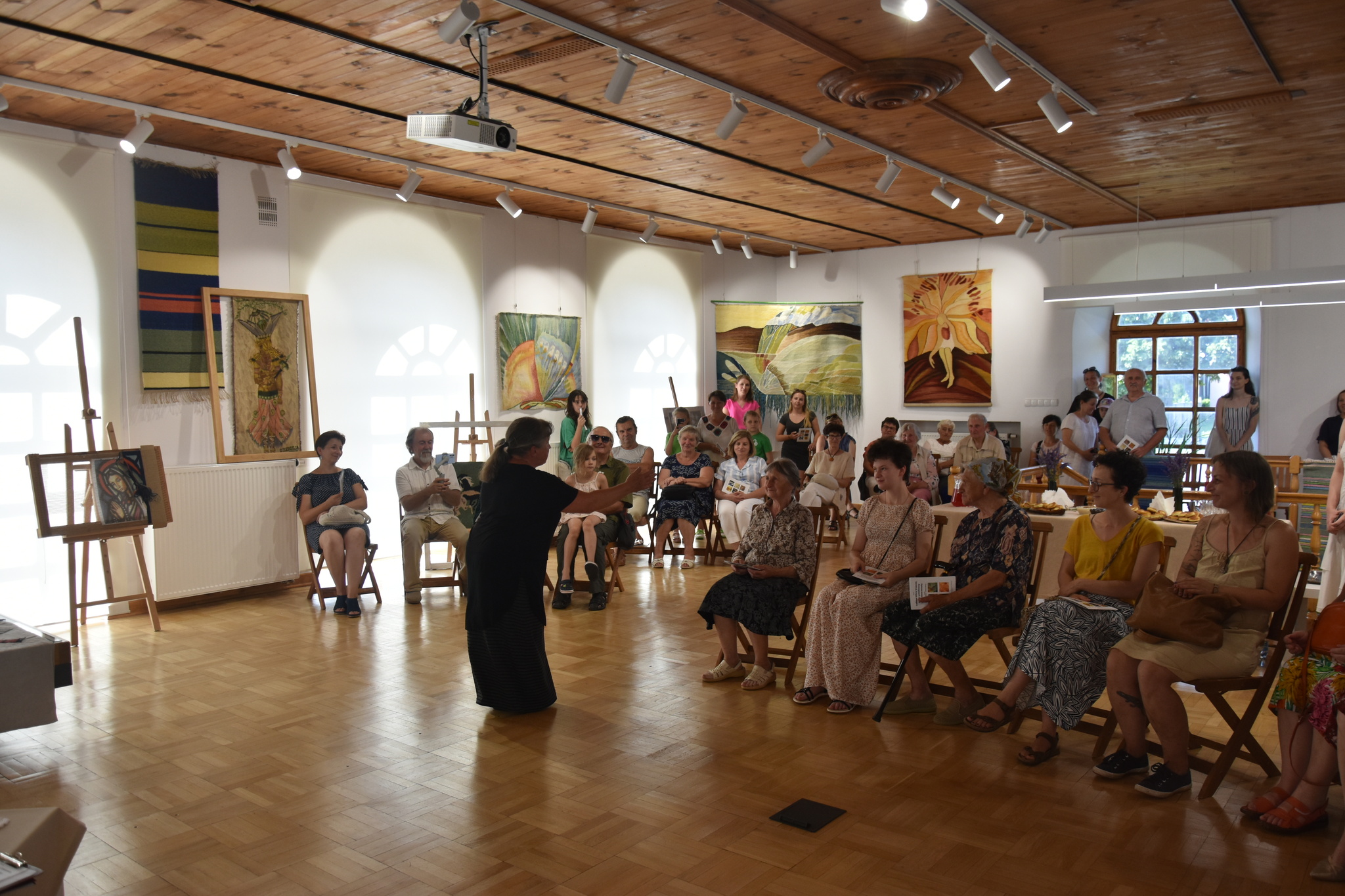 W trakcie wernisażu, uczestnicy mieli okazję spotkać się z autorkami prac i wysłuchać opowieści o ich twórczej drodze oraz inspiracjach. Magdalena Sielicka, która zajmuje się tkactwem od ponad 45 lat, dzieliła się swoimi doświadczeniami z pracy w domach kultury oraz organizowania ogólnopolskich warsztatów tkackich, które przyciągają adeptów z całej Polski. Elżbieta Sielicka, od lat towarzysząca matce w jej pasji, opowiadała o swoich pierwszych gobelinach i pracy nad odtwarzaniem historycznych wzorów.